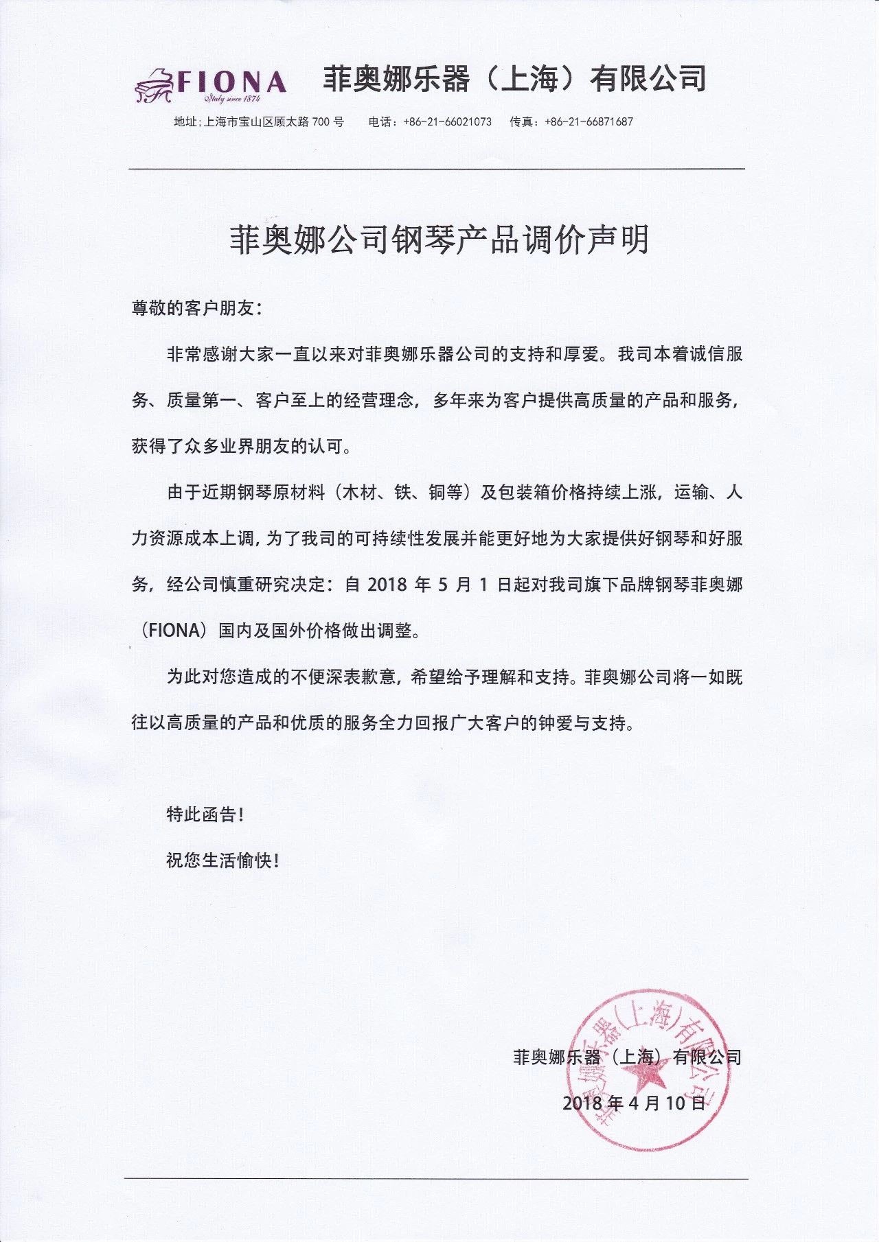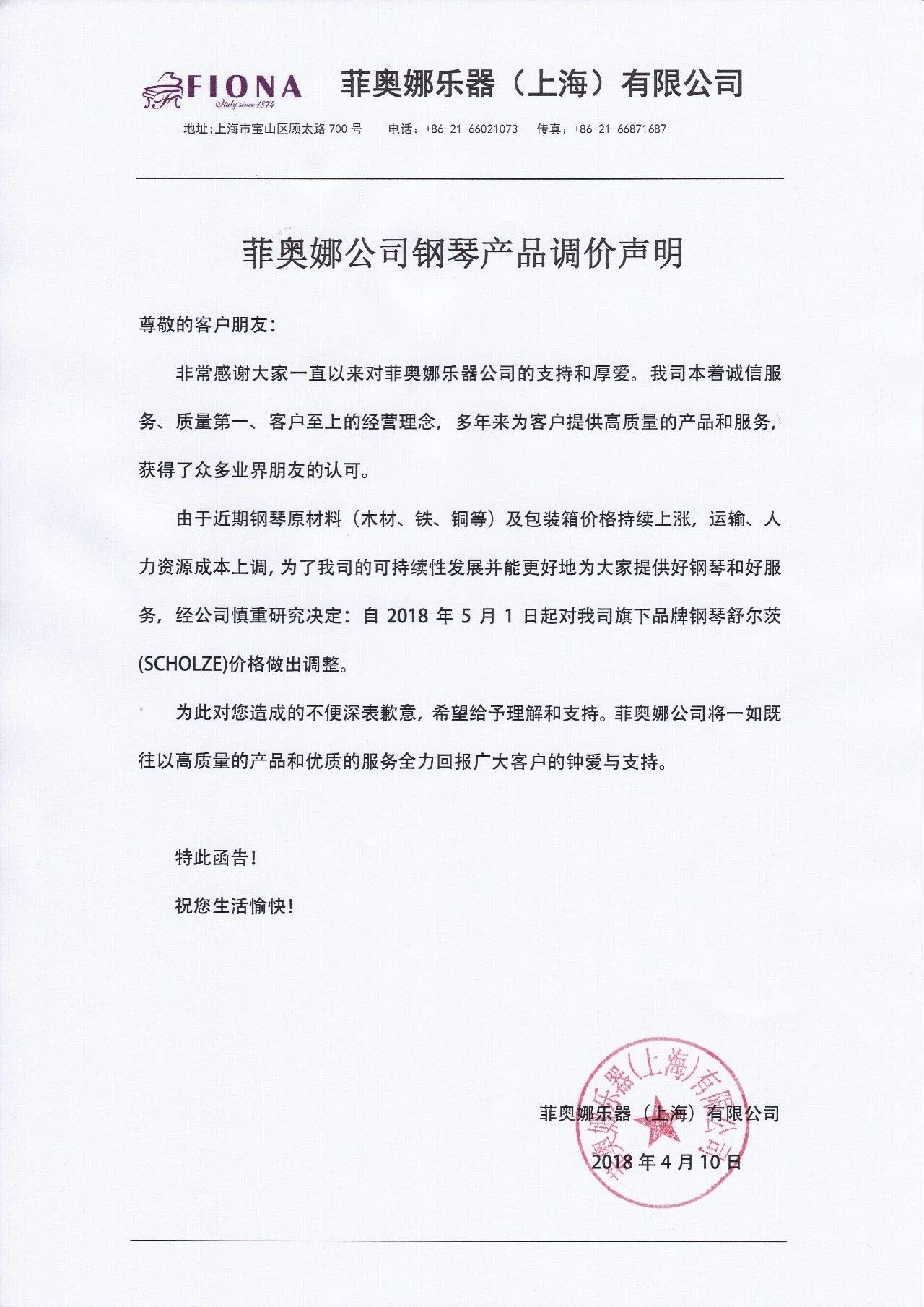 由于近期钢琴原材料(木材、铁、铜等)及包装箱价格持续上涨,运输、人力资源成本上调,为了我司的可持续性发展并能更好地为大家提供好钢琴和好服务,经公司慎重研究决定:自2018年5月1日起对我司旗下品牌钢琴舒尔茨(SCHOLZE)、菲奥娜(FIONA)价格做出调整。